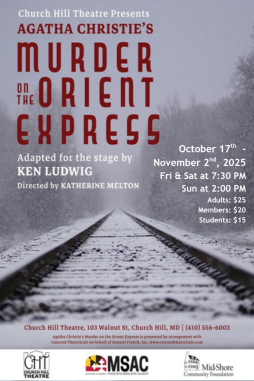 After unexpected roof repairs delayed our original opening in September, Church Hill Theatre is delighted to offer its production of Agatha Christie’s Murder on the Orient Express from October 17 to November 2. The stage play is an adaptation by the hilarious American playwright Ken Ludwig, who was asked to take on the project by the Christie estate. Director Kat Melton will propel her cast on a vintage steam locomotive through the snowy alps. Her use of sound, lights and projections will have you on the edge of your seat as Hercule Poirot uses his “little grey cells” to solve yet another mysterious death!