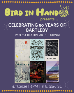 Explore and celebrate 50 years of UMBC’s creative arts journal, Bartleby, and its legacy of non-conformity on April 17 at Bird in Hand! We’ll hear from current and former contributors, have a reflective conversation, and enjoy refreshments from the bar.