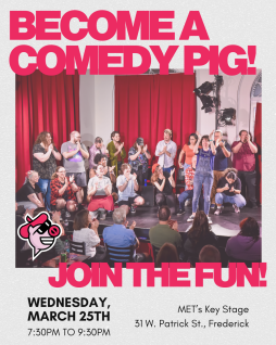 The Comedy Pigs, Frederick area's premier and longest-running short form improv troupe will be auditioning new members on Wednesday, March 25th in Maryland Ensemble Theatre’s Key Stage from 7:30pm to 9:30pm. Founded and continually performing since 1993, The Comedy Pigs are easily one of the most established improv and sketch groups in the entire Mid-Atlantic region. The Comedy Pigs made their mark early as the troupe had been together just two years when in 1995 Comedy Central picked up their music video Wiener Dog- a parody of The Beatles song Blackbird. Since then, the Pigs have written hundreds of sketches and songs, played over 500 performances, and have had dozens of artists call themselves Pigs.