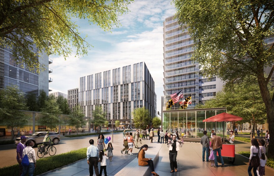 Just north of Baltimore’s downtown, there’s a light-rail stop, a metro station and a set of 1950s-era government buildings. The 28-acre site that comprises all that is called State Center. It’s a part of West Baltimore that abuts Bolton Hill and the McCulloh Homes community. But to the south and east it’s cut off from Mt Vernon, and University of Maryland Medical Center and communities South by Martin Luther King, Jr Boulevard and Howard Street.